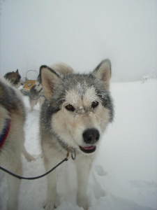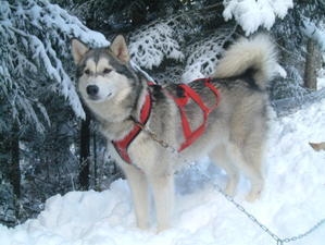 Au traineau, Laïka est notre electron libre. C'est un élément indispensable de l'attelage. Elle est capable de remplacer tous les autres chiens. Son petit gabarit lui permet de suivre Klondike au trot surtout qu'elle ne veut pas montrer à sa voisine que les mala vont moins vite que les groenlandais. Avec elle la ligne est toujours tendue, elle est toujours motivée, c'est une chienne excellente. Elle est malheureusement moins efficace depuis qu'elle a perdu son oeil.